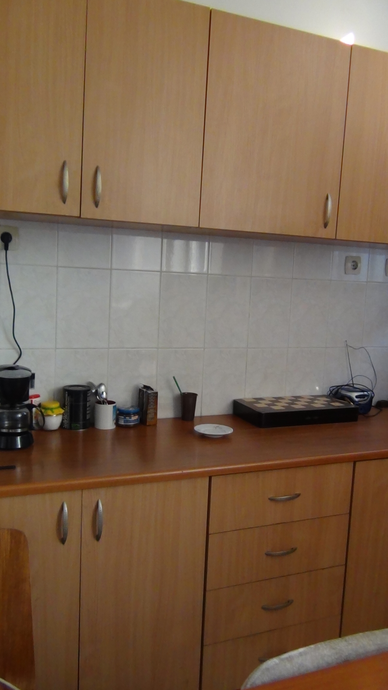 Mobilier de bucatarie - Corpuri suspendate cu 7 usi, corp simplu cu 4 sertare si 6 usi, cu un blat de 80 cm care incadreaza electrocansicele, realizat din lemn, practic, util, aspectos, estetic, bine intretinut, aflat in stare buna.